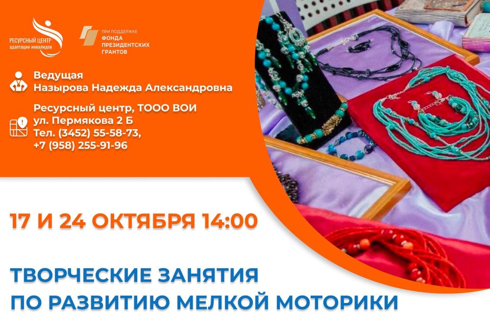 Ресурсный центр адаптации инвалидов приглашает людей с инвалидностью, с 14 лет и старше, 17 и 24 октября в 14.00 на творческие занятия по развитию мелкой моторики. Занятия, в формате мастер-классов,...