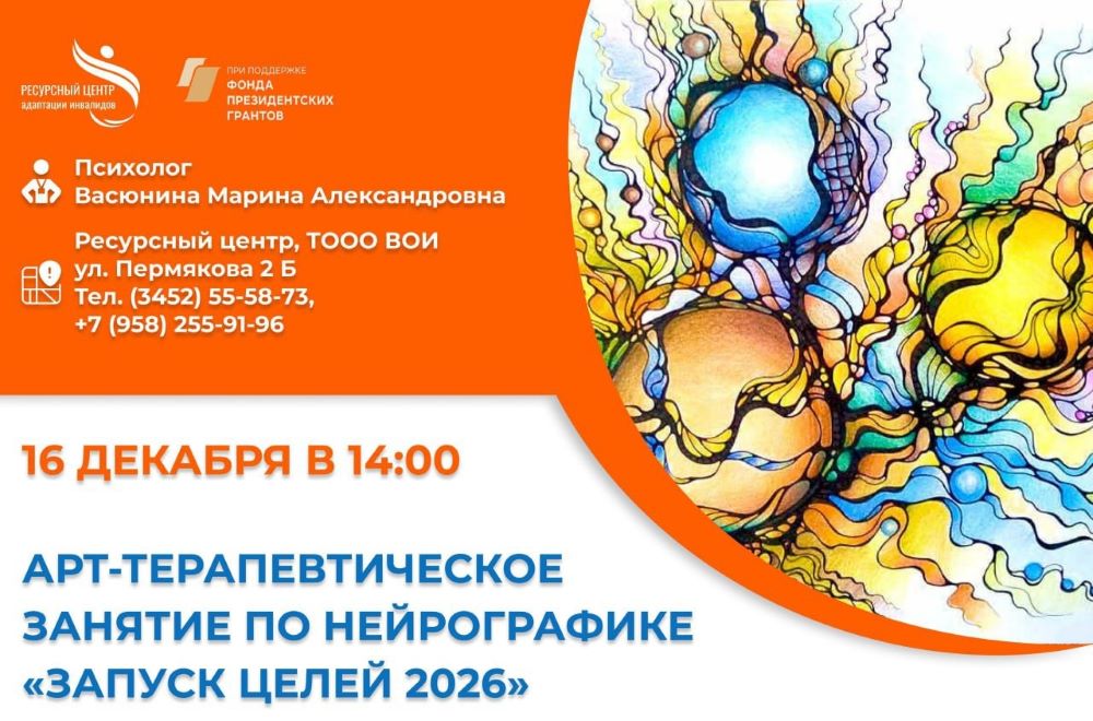 16 декабря в 14.00 в Ресурсном центре адаптации инвалидов (ул. Пермякова, 2 б) состоится арт-терапевтическое занятие по нейрографике «Запуск целей 2026».