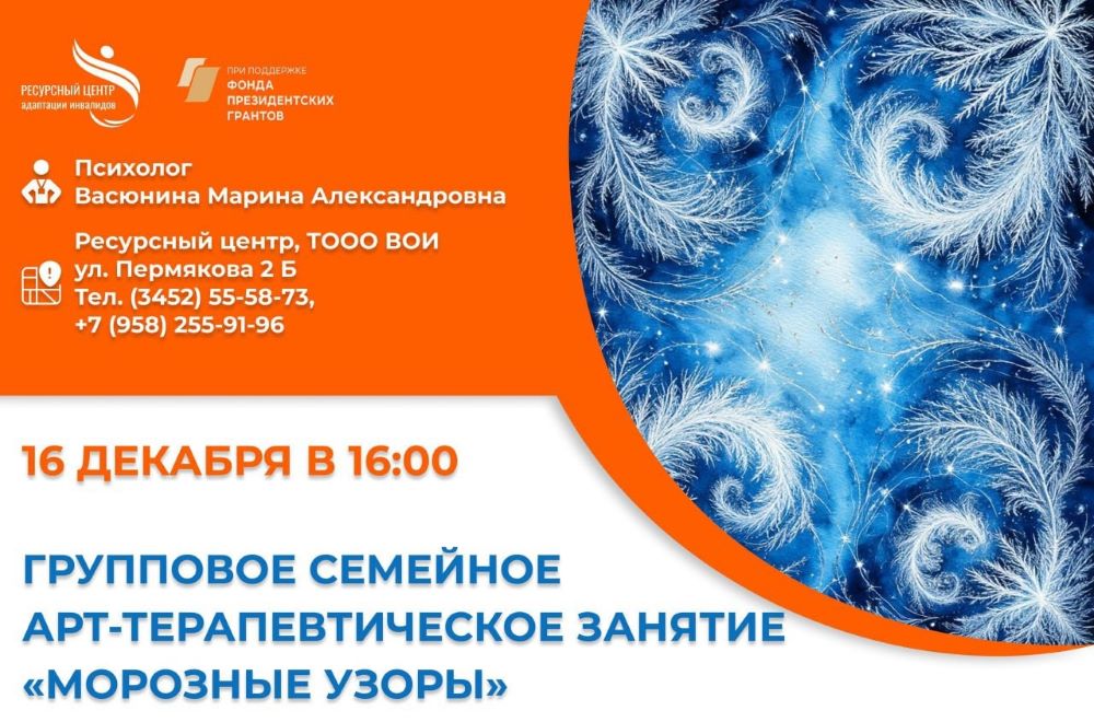 16 декабря в 16.00 в Ресурсном центре адаптации инвалидов (ул. Пермякова, 2 б) пройдёт групповое семейное арт-терапевтическое занятие по технике «Морозные узоры».