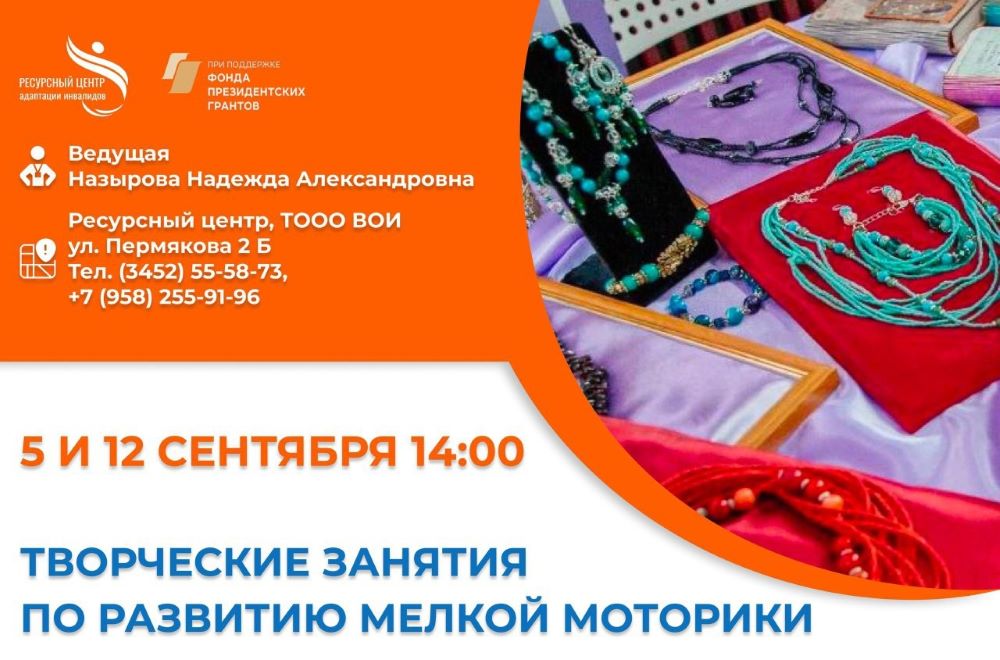 Ресурсный центр адаптации инвалидов приглашает людей с инвалидностью, с 14 лет и старше, 5 и 12 сентября в 14.00 на творческие встречи по развитию мелкой моторики. Проводит занятия - Надежда...